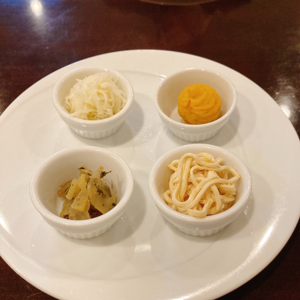 まずは4種の前菜から。じゃがいもの冷製やおし豆腐の山椒風味など、一口ごとに手が込んでいて感動…!🥢 セットの点心も海老蒸し餃子や小籠包、大根餅までついて贅沢すぎる内容です🥟